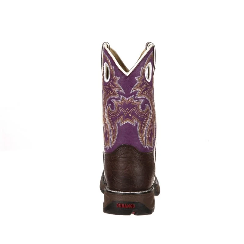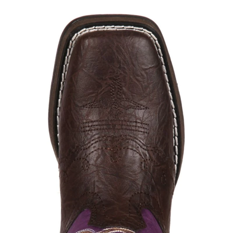 These Lil’ Durango® square toe boots have a leather-like upper; while the material looks great, it is far more durable than traditional leathers and can be cleaned easily. Most little girls love a bright color; the purple hue on the shaft gives them a pop of color that they’ll adore, while the dark brown shade on the foot allows this Western boot to coordinate with numerous outfits.