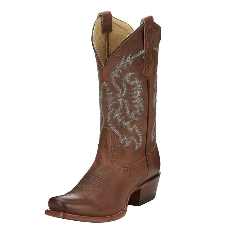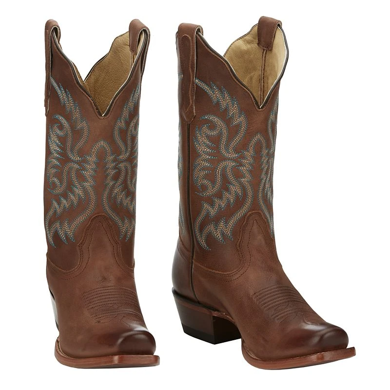 The 11-inch Bluebonnet Tan is a fashion boot with vintage class. The distressed golden brown leather exterior is embellished by a light turquoise and cream stitch pattern along the upper. The narrow square toe and elevated heel add an edge and the scalloped collar provides a feminine touch. The cushioned insole guarantees lasting comfort and support in and out of the saddle.