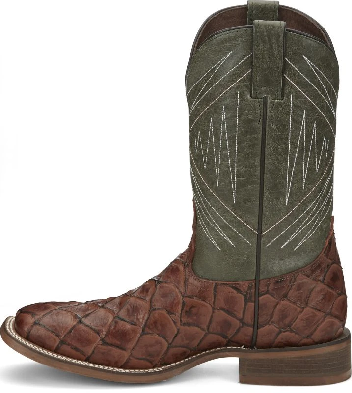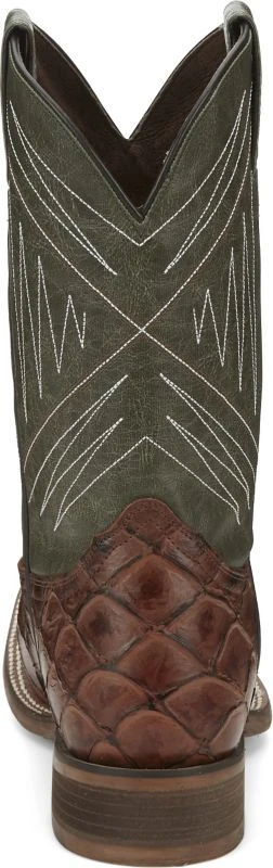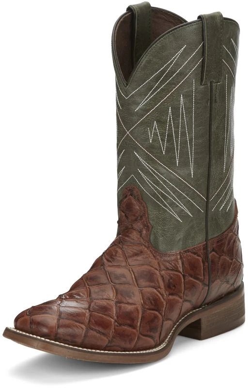 The 11″ Newt boot in Cognac from the Hero Collection makes a commanding impression, with an exotically inspired fish-print foot and dynamic stitching on the cactus-green shaft. It features an orthotic insole, square profile toe and 1 1/8 inch tapered heel.