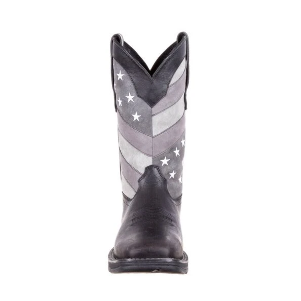 This 12-inch Rebel by Durango boot features a faded black and grey American flag, a different take on our original flag boot. The square toe and double-row welt stitching allow these boots to look like your traditional Western boot. The Cushion Flex insole and ventilated cushion footbed will provide your feet with comfort that lasts all day long, while the tempered steel shank supplies support and give you stable footing. The rubber outsole on the footwear is lightweight and extremely flexible for easy movement.