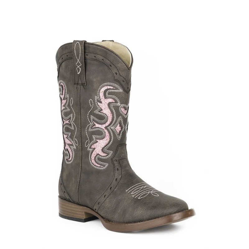 The Roper Kids’ Lexi Square Toe Cowgirl Boots feature a vintage style with a modern twist. These boots are made from durable synthetic leather with Western stitched brown vamp and shaft with a pink glitter underlay design. The wide square toe, soft inner lining, padded insole, and pull loops make the Lexi Boot comfortable choice for your little cowgirl.