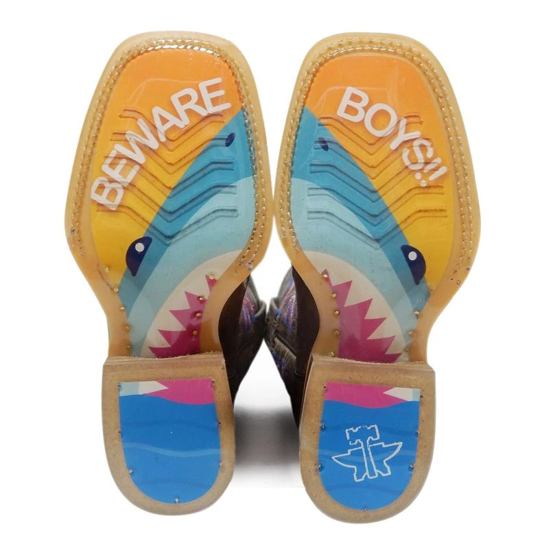 Crafted from genuine leather, Tin Haul Kid’s Sharky Maneater Sole Boots are handcrafted and feature a fully embroidered leather shaft, inlayed leather vamp design, and a beautifully designed sole.