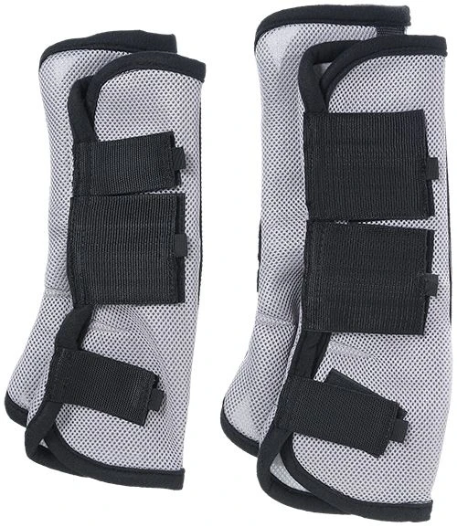 Durable comfort mesh fly boots protect legs from biting insects and provide UV protection to the lower leg. Large “quick grip” closures make for easy on/off. Lower straps have elastic to provide comfort allowing the boot to move with your horse. A flexible spine provides support to keep the boot upright while a neoprene roll, located above the joint, keeps boot from collapsing as the horse moves. Set of 4.